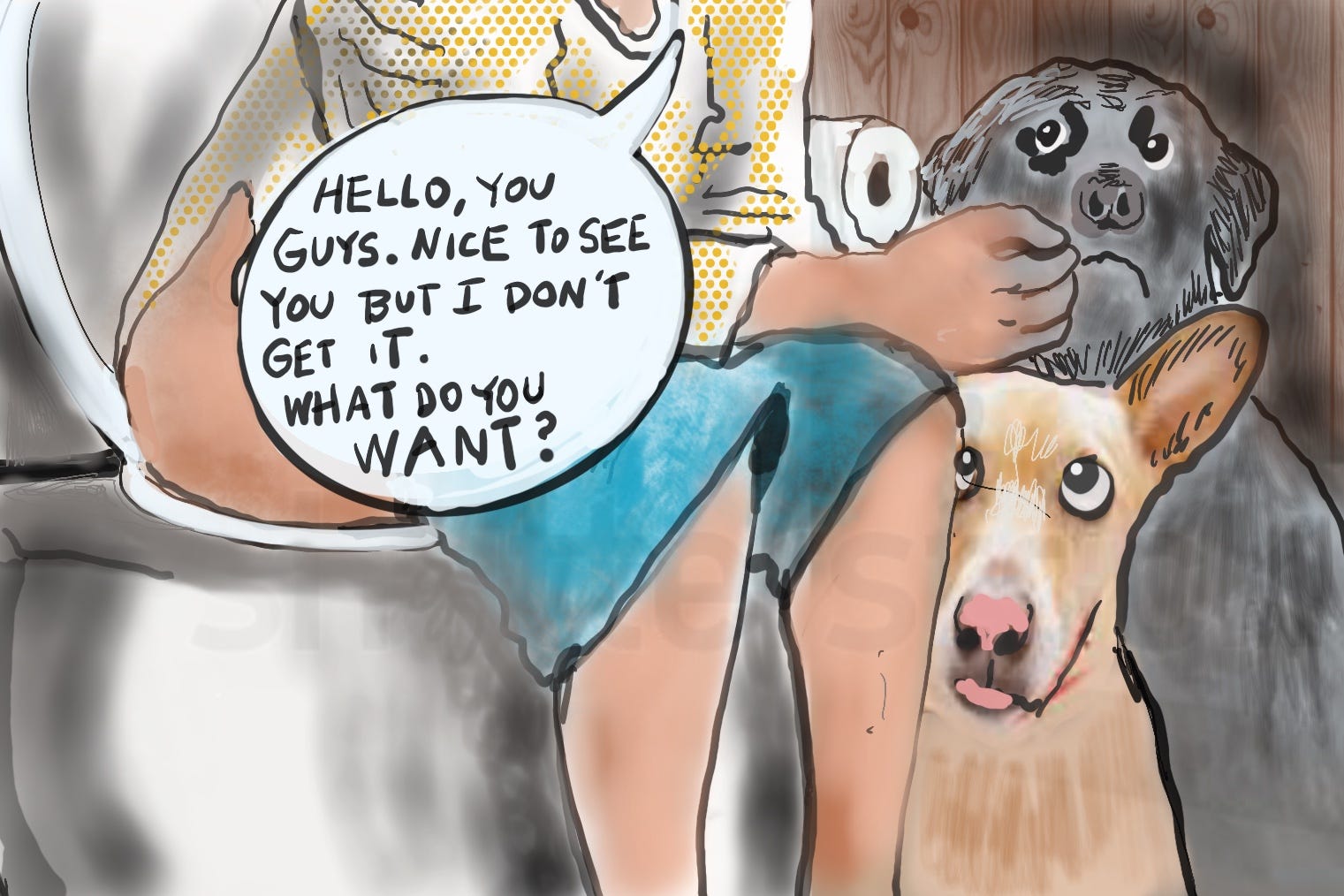 Meanwhile, there is NO quid pro quo with my dogs. Zero.In fact, to repay me for all my kindnesses, one of my dogs (who shall remain nameless) tried, repeatedly, and without remorse to literally dissemble my house. On several occasions, when I left him alone, he ate past the painted wood interior straight thru to the dry wall and was headed beyond when I was forced to hire a handyman who attached metal sleeves to all the chewed up windowsills and door jams. At one point, as said handyman was sinking concrete under the fence in the backyard so that the dog couldn’t tunnel out, he looked at me like he thought I was feeble minded and said “You must really want this dog to stick around.” And for the first time in my life, I, who pride myself on always having a come-back, could not think of any response. Instead, in my endless search for a solution to what had been diagnosed as this particular dog’s “separation anxiety” I actually contemplated having his teeth removed.