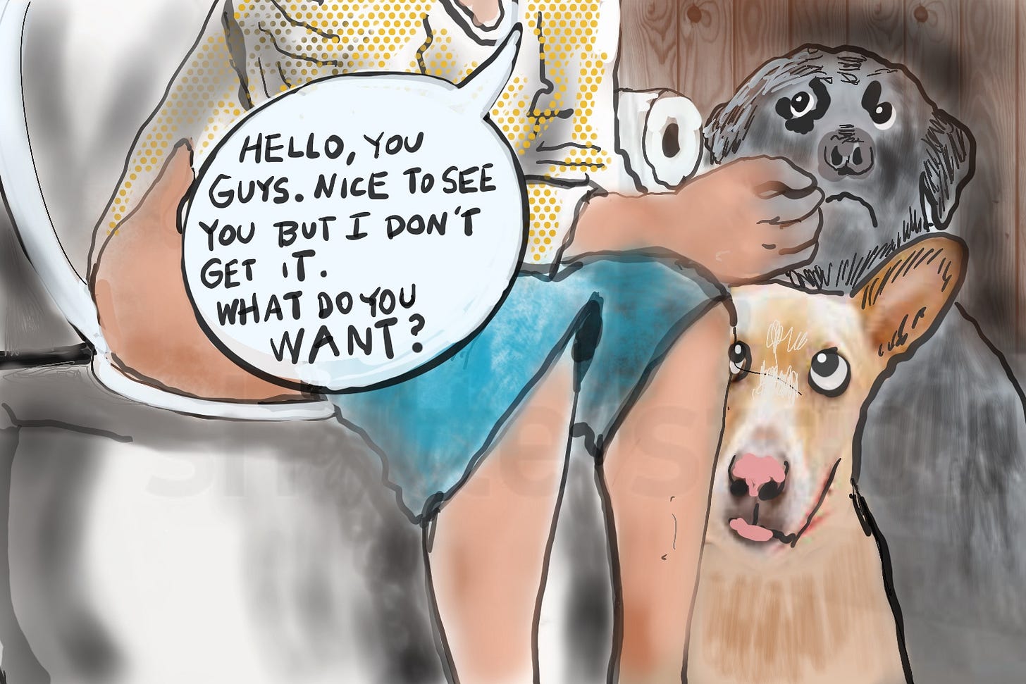 Number 2. The gaslighting that goes on in all areas of our relationship is off the charts. Every day I watch myself voluntarily enabling the kind of narcissistic responses from them that I would never tolerate from a member of my own species. For example, if my brother woke me up at 5:30 AM by jumping on top of me and then continued to stand on the bed, poking at me and yelling “Are you just going to lay there sleeping forever? I’m starving. ”under no circumstances would this behavior make me smile because I was finding it adorable.